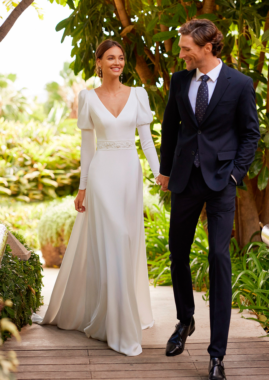 Vestido de novia con un diseño que estiliza la figura y aporta el equilibrio perfecto entre sensualidad y sofisticación. Destaca por su escote cuadrado que aporta una elegancia contemporánea, mientras que el fajín drapeado en gasa de la cintura realza la silueta de forma sutil.