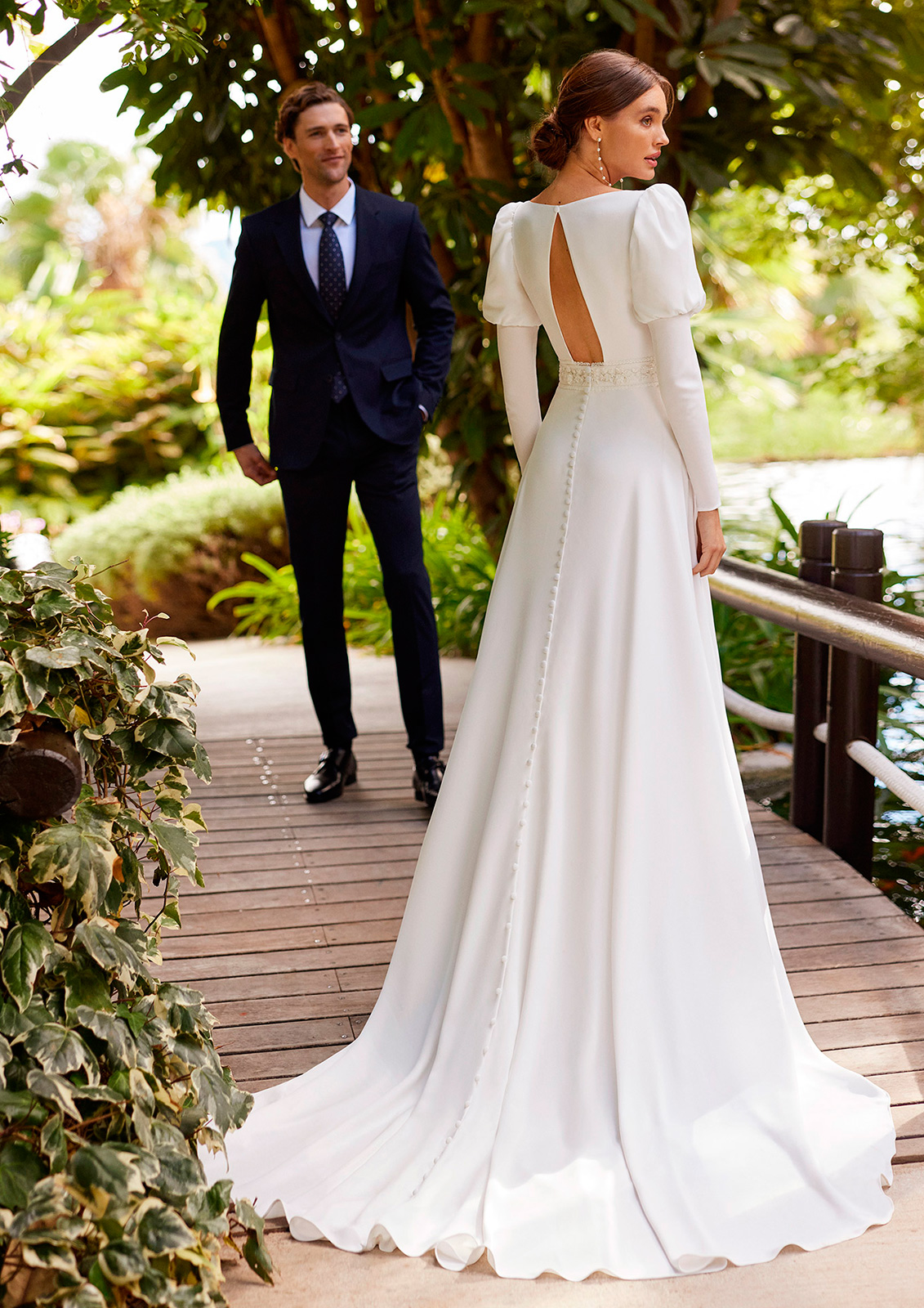 La espalda se convierte en el gran protagonista con el detalle de flor artesanal, elaborada a mano pétalo a pétalo, que aporta un aire romántico y único. La falda, se distingue por una delicada abertura delantera, que culmina en una cola con movimiento y caída espectacular. Ideal para novias modernas que no renuncian al diseño más icónico y femenino.