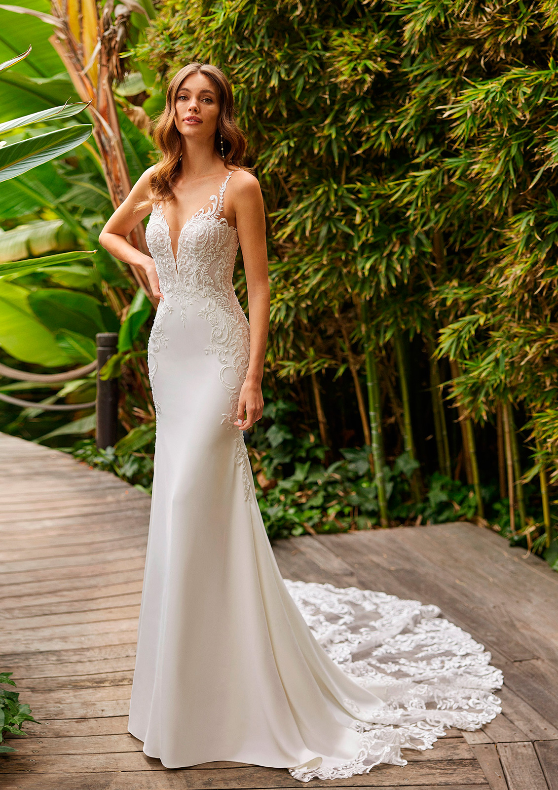 La espalda se convierte en el gran protagonista con el detalle de flor artesanal, elaborada a mano pétalo a pétalo, que aporta un aire romántico y único. La falda, se distingue por una delicada abertura delantera, que culmina en una cola con movimiento y caída espectacular. Ideal para novias modernas que no renuncian al diseño más icónico y femenino.